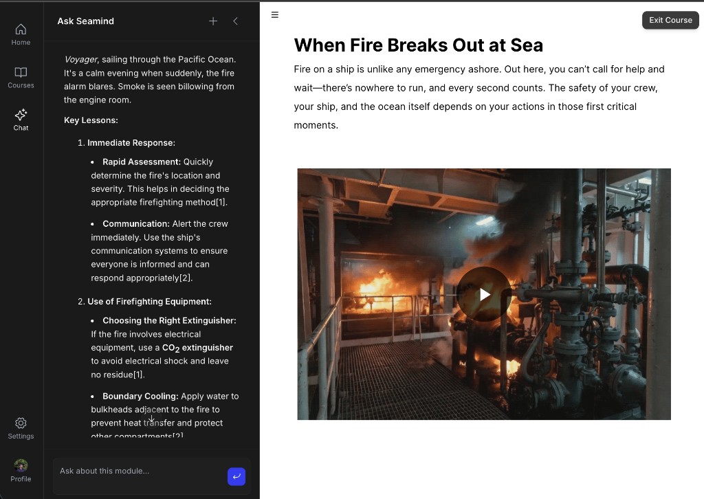 Seamind Tutor is the AI layer crews actually use — in training and on the job. Ask in plain language; get answers grounded in STCW, ISM, MARPOL, SOLAS, ISPS, and your uploaded policies. Citations keep you audit-defensible; tone stays appropriate for the bridge and the engine room.
